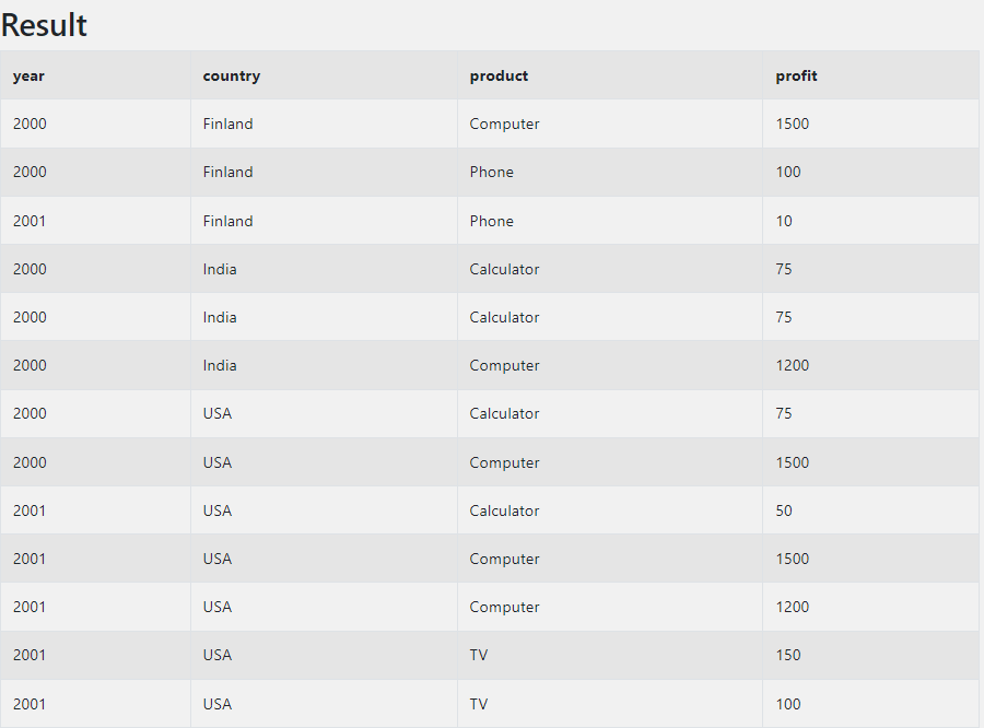 INSERT INTO `sales` (`year`, `country`, `product`, `profit`) VALUES ('2000', 'Finland', 'Phone', 100);