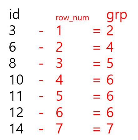 row_num 값을 각 id값과 빼면 다음과 같이 연이은 id 번호에 대해 일정한 패턴이 나타난다. 즉, 연속된 id 번호는 grp에서 같은 값을 가지게 된다. 따라서 grp로 그룹화하여 그룹별 행의 개수가 3이상인 row들을 출력해주면 정답이 된다.