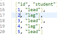 위와 같은 쿼리로 접근할 경우, [CASE 문으로 생성된 컬럼명 student]의 컬럼값으로 [lead, lag 컬럼의 컬럼값]이 대입되는 것이 아닌 [문자열 'lead', 문자열 'lag']가 저장되는 것을 알 수 있다.