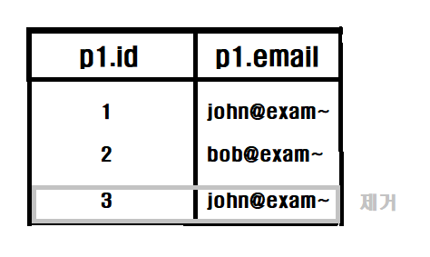 이메일이 중복된 경우, id 값이 작은 값을 제외하고 제거해줘야 한다. 이를 구현하면 아래와 같이 풀이할 수 있다.
